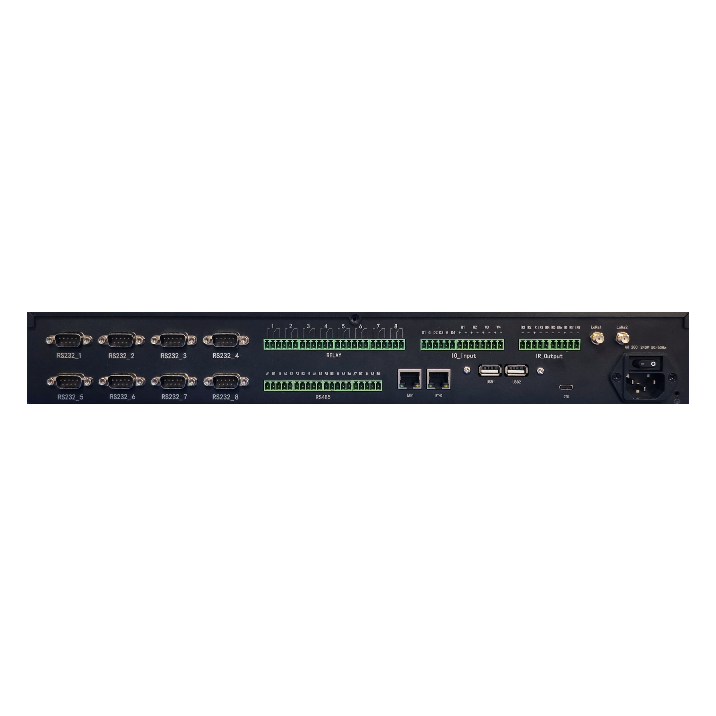 IoT host, pure local deployment.The hardware features a Gigabit Ethernet port, multiple serial ports (RS232/485), IO and relay interfaces, with USB expansion support. It integrates an infrared module (compatible with 90% of brands) and 2 LoRa wireless channels. The front button enables one-touch scene linkage, while a 2.8-inch color screen visually displays the device's operational status.